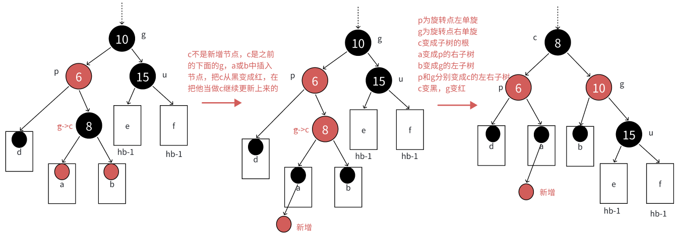 这里触发双旋+变色的情况和单旋那里一样,在u存在且为黑的条件下c必须也为黑,此时的c同样不是新增节点,理由同上。