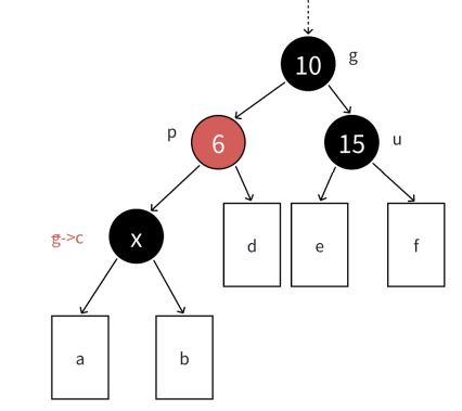 这是g的父亲节点为黑的情况,为黑更新就结束了,但是因为g是黑色,g的父节点(不为根节点的情况下)还可能是红色。如果是红色,就会又有连续红节点的情况。