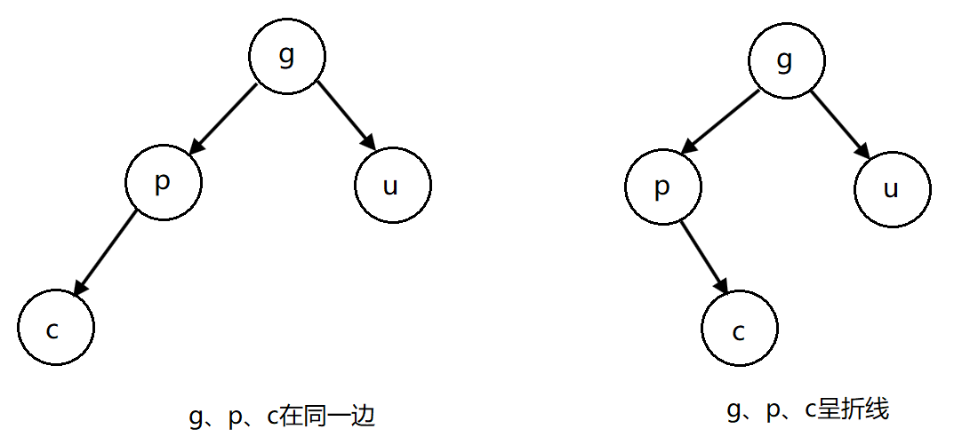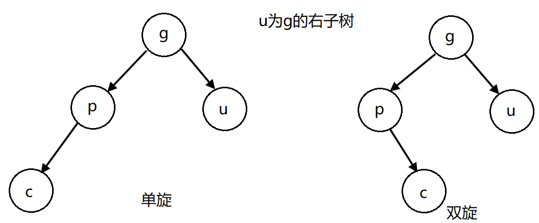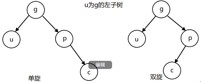上面这种情况是u为g的右子树,并且c是p的左子树,如果u是g的左子树,我们就以g为旋转点进行左旋就好了。