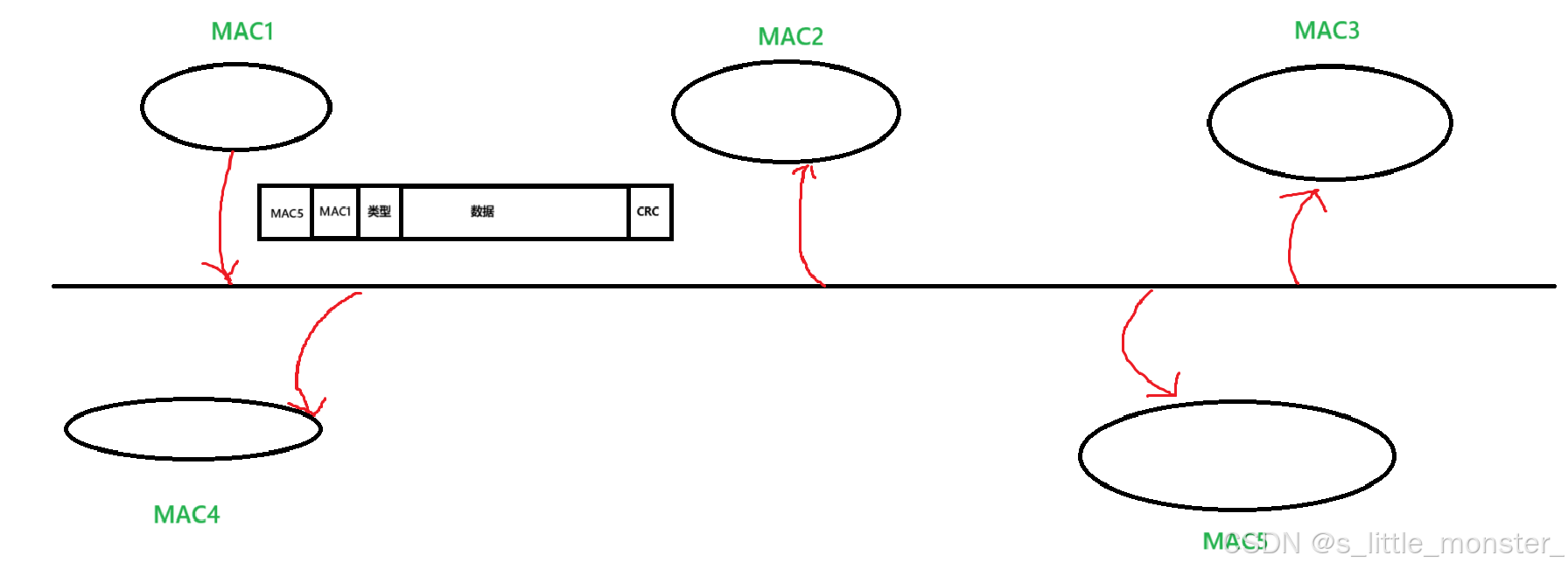 - 假设此时局域网中只有MAC1在发消息,MAC1发送到局域网中的消息是会被所有主机接收的,只是我们当前MAC1发送的报文是给MAC5的,所以其他主机在收到消息之后,检查一下目标地址,嘿,不是我,那我扔了,之后MAC5在接收到消息后会将其继续向上传输