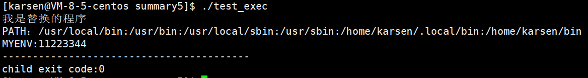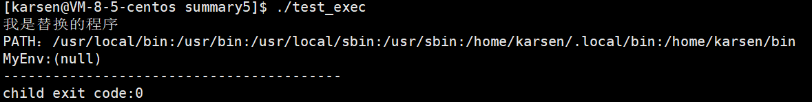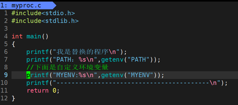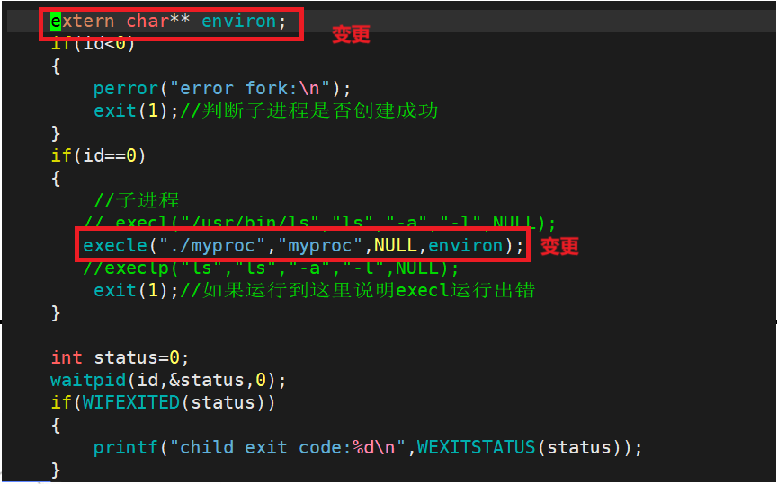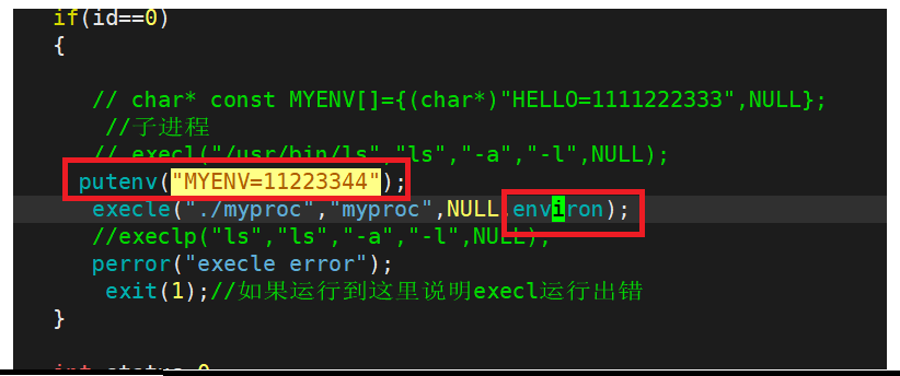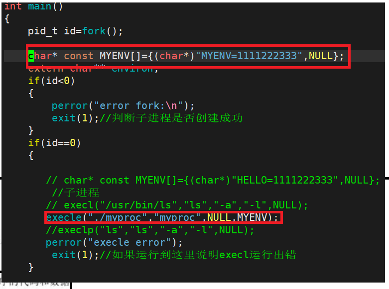 然后将上面execl的示例程序中的execl改成execle,用execle替换上述写的myproc程序。