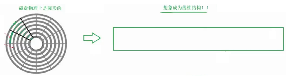磁盘也是一样,将磁盘抽象成线性结构,从逻辑上把整个磁盘看作一个数组sector arr [n];其中每一个元素就对应一个扇区。这样说十分抽象,下图较为清晰的展现这一过程。