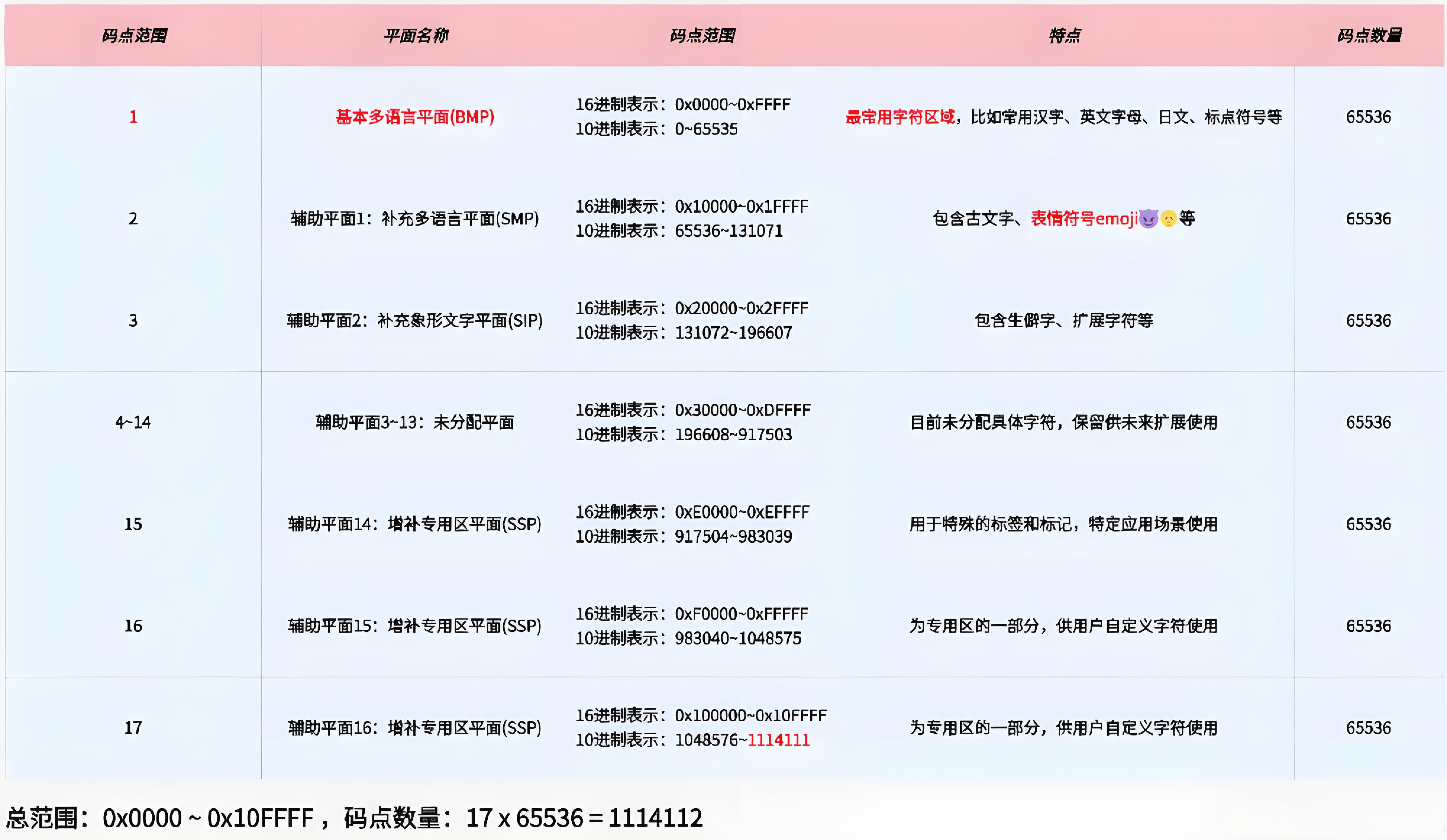 : 一个码点永远只对应一个字符(语义上),反之亦然(理想情况下)编码空间与平面