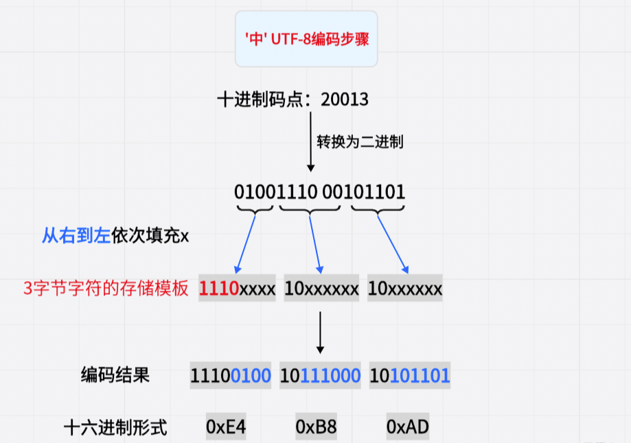字节存储,其十六进制形式是0xE4 0xB8 0xAD
