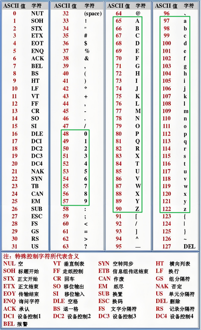 ,包含英文字符、数字、符号、控制字符扩展 ASCII