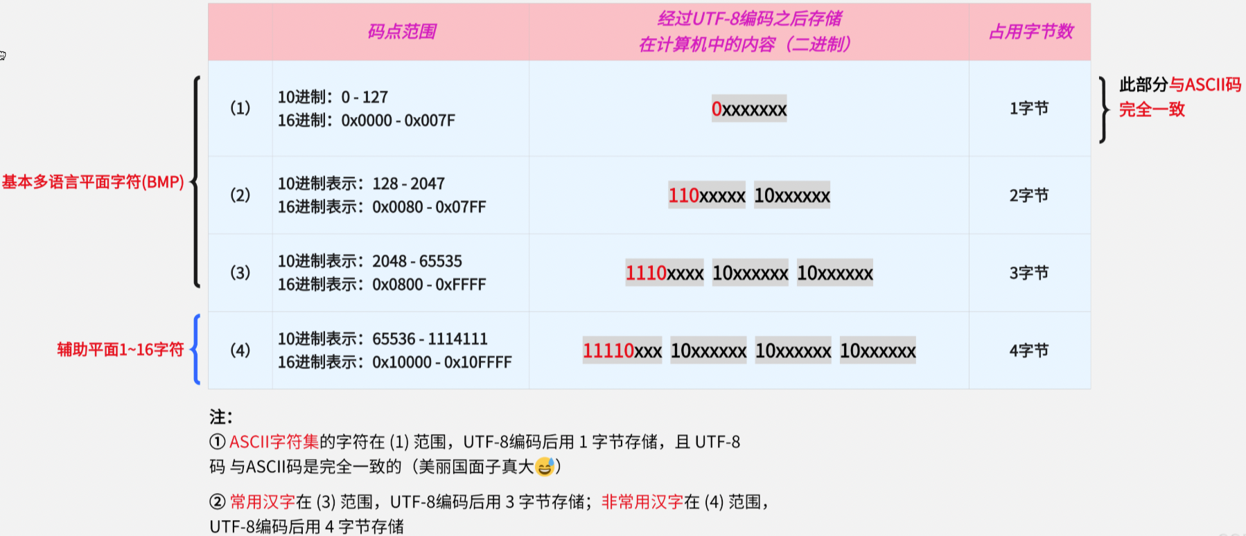 不同字符通过 UTF-8 编码之后,存储在计算机中的内容用1~4