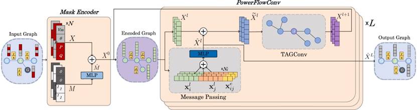 图1:PowerFlowNet 模型架构由一个掩码编码器和 𝐿 PowerFlowConv 层组成。包含不完整特征信息的输入图被逐个节点地输入到掩码编码器,以生成编码后的图特征,其中每个节点 𝑛 ∈ 𝑁,且 (𝒙𝑖, 𝒎𝑖)。然后,编码后的图特征由一系列 𝐿 顺序 PowerFlowConv 层处理,每个层包含一个单步消息传递和一个高阶 TAGConv。最终生成完整的输出图。