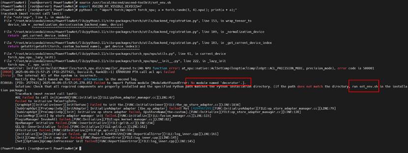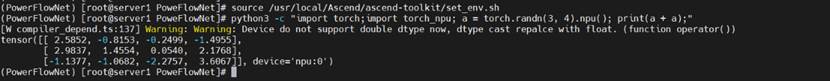 执行python3 -c "import torch;import torch_npu; a = torch.randn(3, 4).npu(); print(a + a);"
