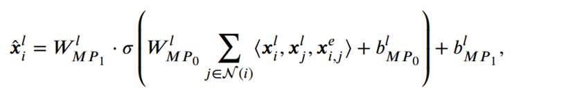 ⟨𝑥𝑙𝑖, 𝑥𝑙𝑗, 𝑥𝑒𝑖,𝑗 ⟩ 是上述向量的串联向量,输入到带有中间 ReLU 激活函数的双层多层感知器 (MLP)。这里再次显示权重矩阵和偏置向量𝑊𝑙𝑀𝑃1, 𝑏𝑙𝑀𝑃1, 𝑊𝑙𝑀𝑃0, 𝑏𝑙𝑀𝑃0是第 𝑙 层 MLP 的可训练参数。之后,我们通过将图特征 𝑋𝑙 与消息 𝑋̂ 𝑙 相加来更新图特征 𝑋𝑙,即 𝑋̂𝑙 ← 𝑋𝑙 + 𝑋̂𝑙。然后,TAGConv 层处理信号 𝑋̂𝑙,生成新的编码图特征 𝑋𝑙+1。