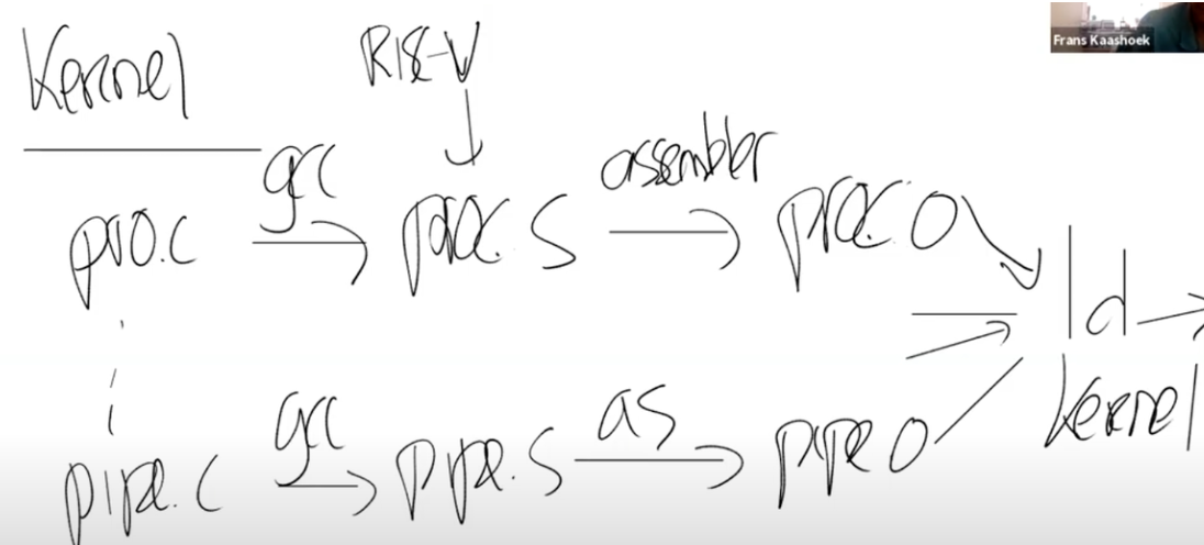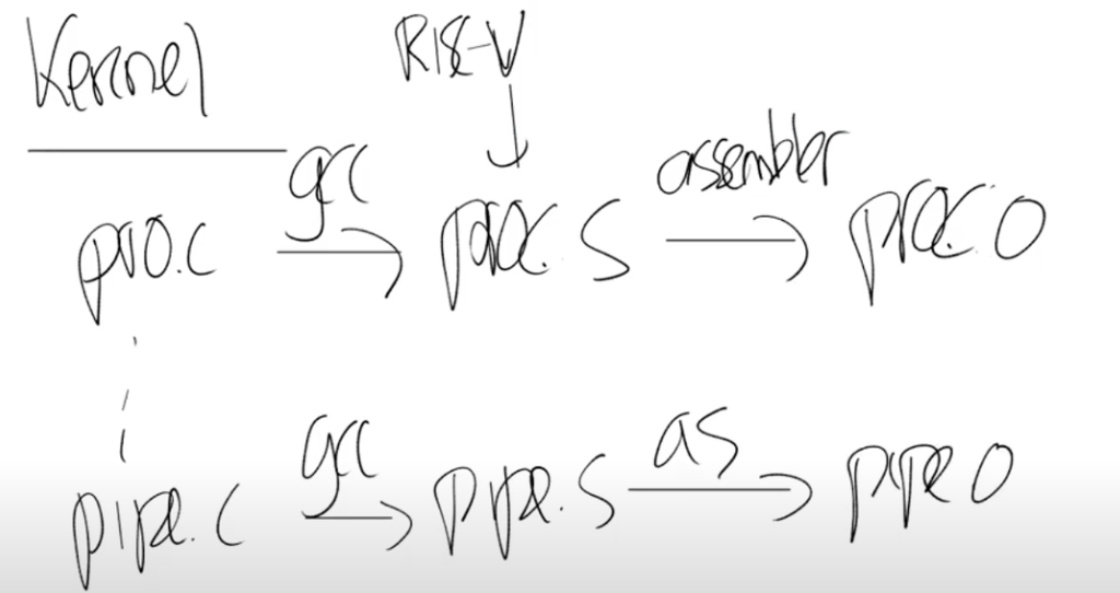 kernel。我们可以ls kernel的内容,里面包含了基本上所有的内核文件。因为XV6是一个宏内核结构,这里所有的文件会被编译成一个叫做kernel的二进制文件,然后这个二进制文件会被运行在kernle mode中。user。这基本上是运行在user mode的程序。这也是为什么一个目录称为kernel,另一个目录称为user的原因。mkfs。它会创建一个空的文件镜像,我们会将这个镜像存在磁盘上,这样我们就可以直接使用一个空的文件系统。Makefile(XV6目录下的文件)会读取一个C文件,例如proc.c;之后调用gcc编译器,生成一个文件叫做proc.s,这是RISC-V 汇编语言文件;之后再走到汇编解释器,生成proc.o,这是汇编语言的二进制格式。