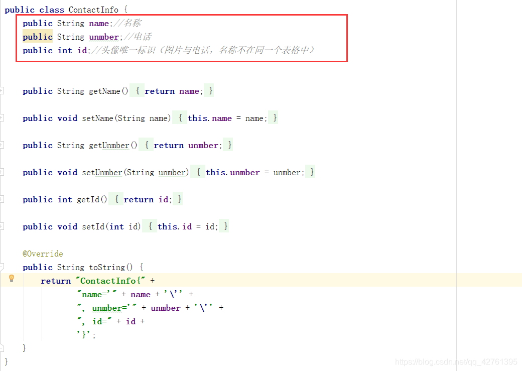 2.创建一个实体类,来放名字和号码,和取图像的唯一标识(图片与号码,名称不在同一个表中)