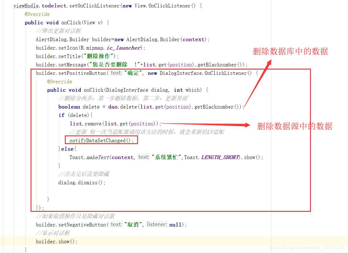 使用 Adapter.notifyDataSetChanged() 时,必须保证传进 Adapter 的数据源是同一个数据源,否则无效,大多使用时与数据库结合使用,但是记得增删改查不仅仅是要删掉数据库中的数据,而且也要删掉相应数据源中的数据
