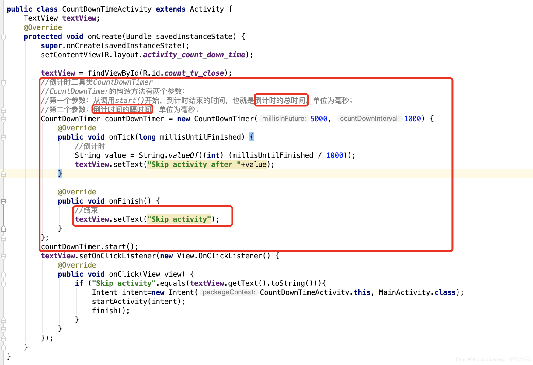 //第一个参数:从调用start()开始,到计时结束的时间,也就是倒计时的总时间,单位为毫秒;