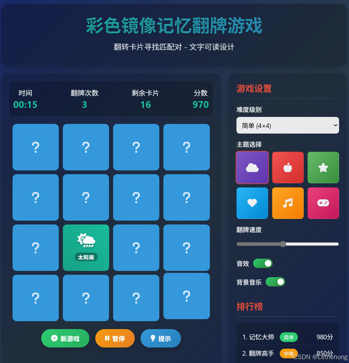 2. 游戏设置 - 提供多种难度级别(简单:4x4,中等:5x5,困难:6x6) - 可选择不同主题的卡片图案(动物、水果、emoji表情等) - 调整游戏速度和翻牌时间 - 开启/关闭音效选项