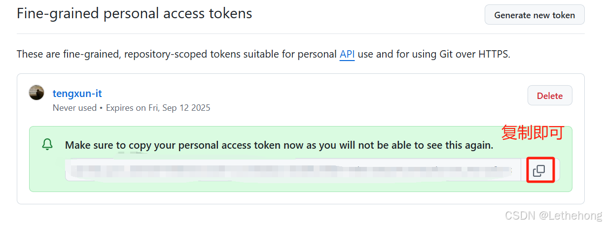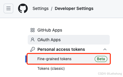 访问路径为:Settings / Developer Settings / Personal access tokens / Fine-grained tokens