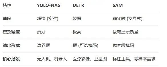当前有三大模型占据主流视野:追求极速的YOLO-NAS、专注精准的DETR,以及零样本分割王者SAM。它们各有所长,也各有局限。