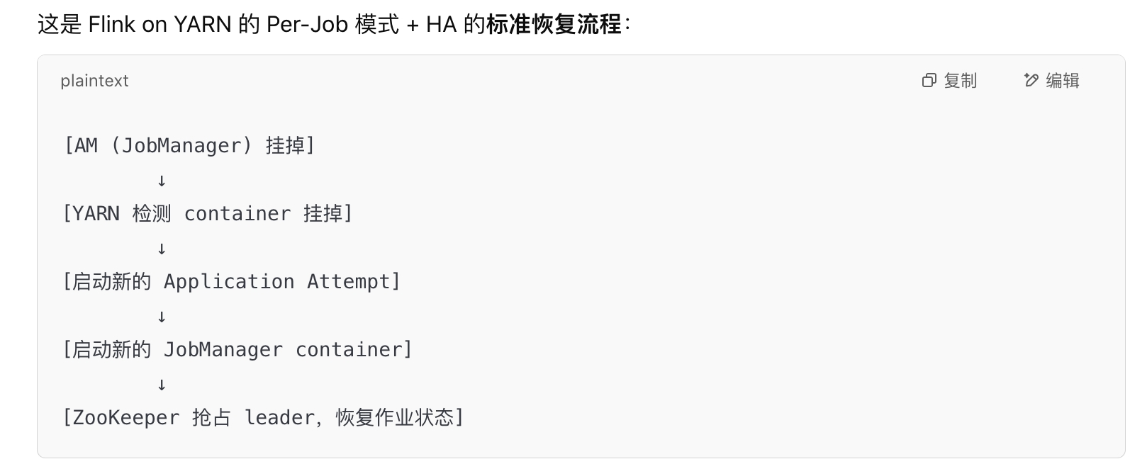 yarn.application-attempts = 2答案: jobmanager 异常时能够拉起,但是无法自动从状态恢复,因为没有 high-availability 去查询可用的 checkpoint 等等,虽然在 hdfs 上有,但是这个路径和查询必须通过 zookeeper 中的元信息指针才能读取到;