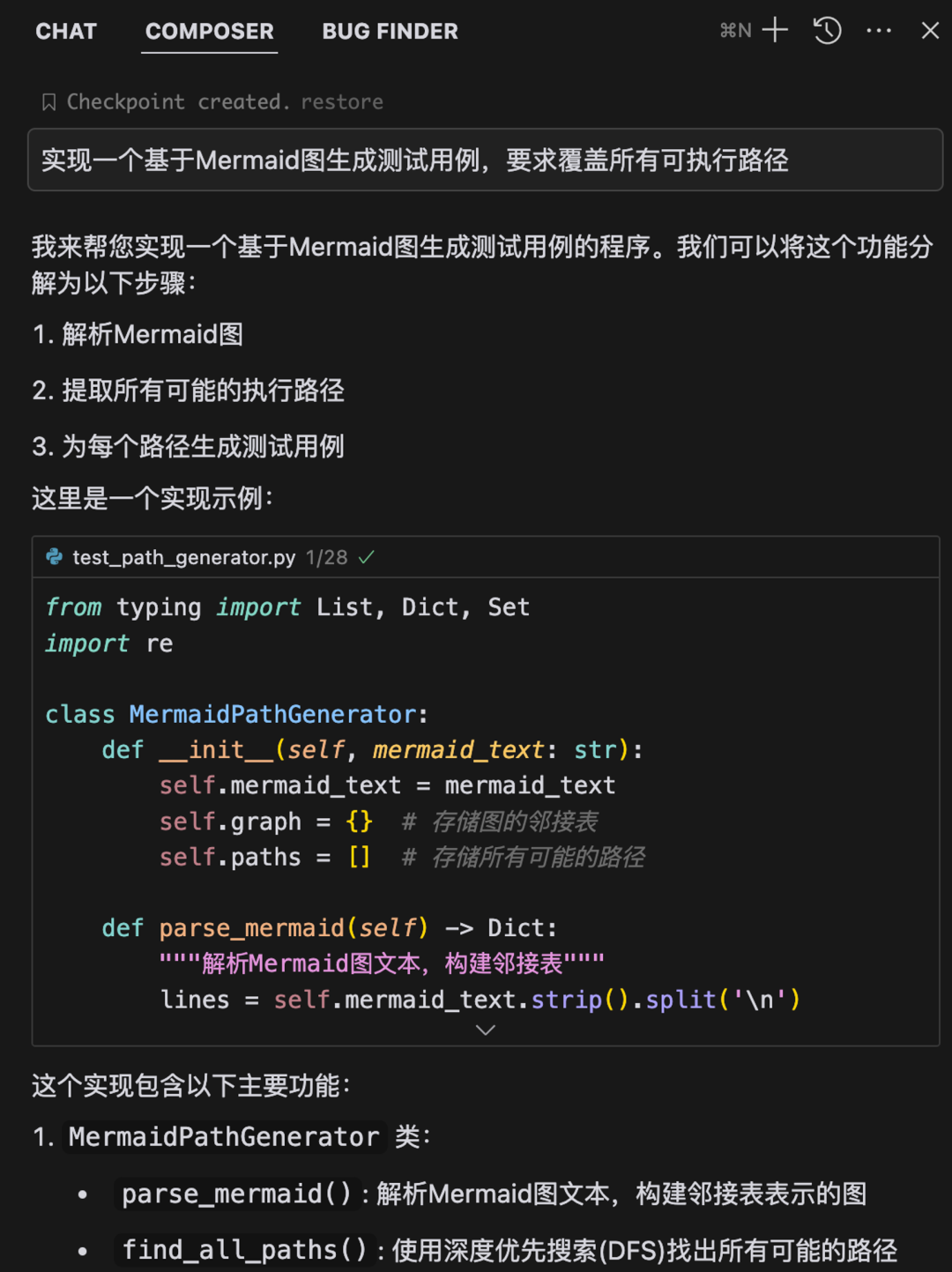 前面通过LLM能够帮我们理解需求生成状态机图,如果想基于状态机找全测试路径,我们尝试使用AI编程工具来辅助生成规则工具,来确保每次遍历的路径是一致的。