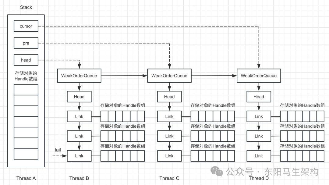 所以每个线程都会有一个Map,这个Map的key是Stack,这个Map的value是WeakOrderQueue。每个线程的Map表示的是对这个线程来说,不同的Stack对应着其他线程绑定的Stack,而由其他线程创建的对象会存放在其他线程绑定的Stack的WeakOrderQueue里。