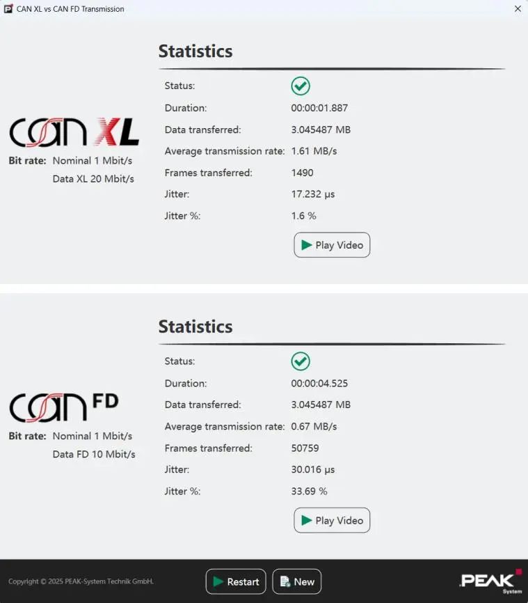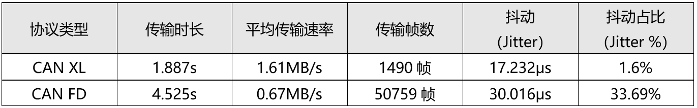 本次测试中,CAN XL以1.887秒完成传输,平均速率达1.61MB/s;CAN FD传输耗时4.525秒,速率仅0.67MB/s。