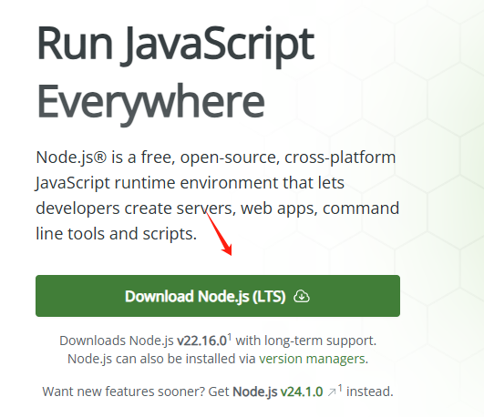 首先去Node.js官方下载安装包安装: https://nodejs.org/en