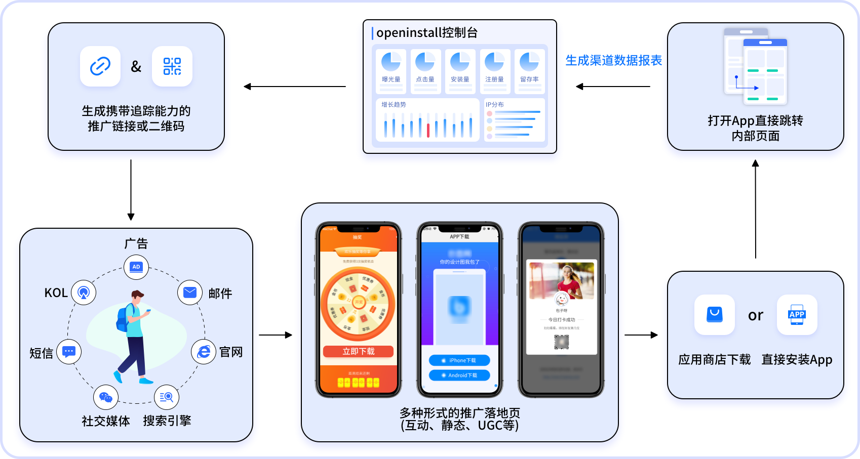 openinstall提供企业级智能深度链接与渠道追踪技术,覆盖社交媒体、邮件、短信、网页及线下场景,实现三大突破: