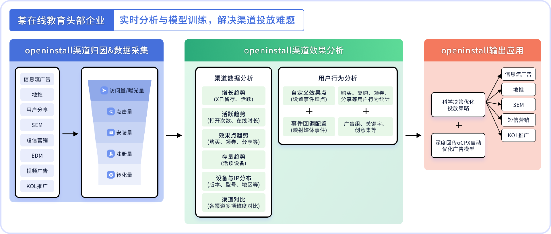 更进一步:该集团还通过openinstall进行一站式多平台广告买量监测,针对华为、抖音、小红书、百度等多种类型的广告媒体投放信息流广告,借由Last Click归因模型与深度回传能力,持续优化买量投放模型,实现全方位多渠道的降本提效。