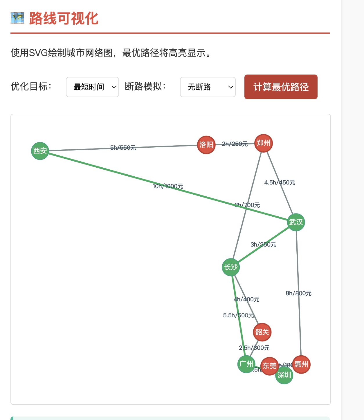 '武汉': { '惠州': { time: 8.0, money: 800 }, '长沙': { time: 3.0, money: 350 }, '郑州': { time: 4.5, money: 450 }, '西安': { time: 10.0, money: 1000 } },