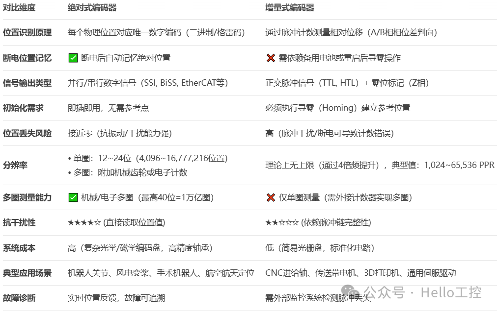 绝对编码器和增量编码器在运动控制系统中各有不同的用途。它们的区别在于如何跟踪位置、应对断电、提供精度以及适合各种应用。