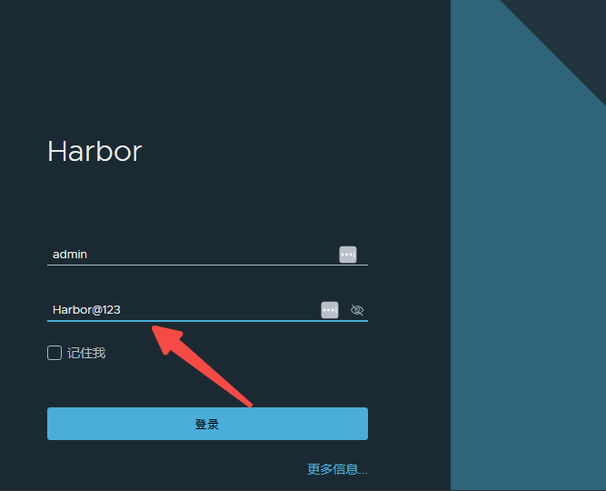Harbor 管理员账号:admin,密码:Harbor@123。密码同步使用配置文件中的对应password