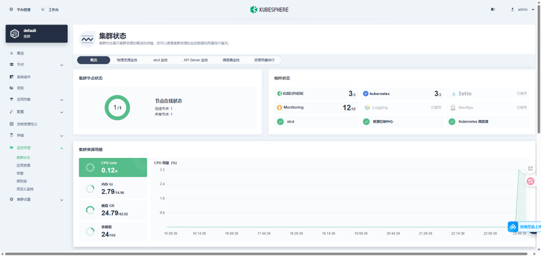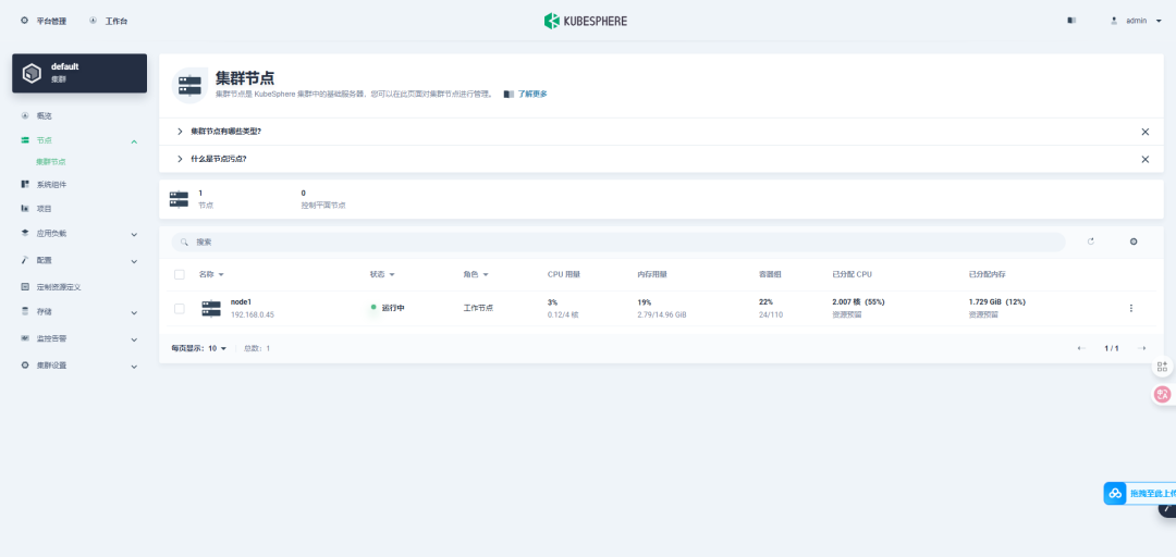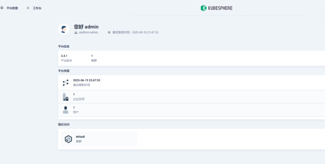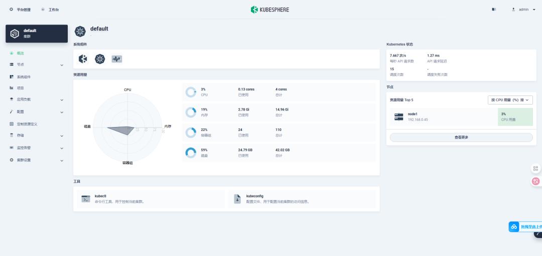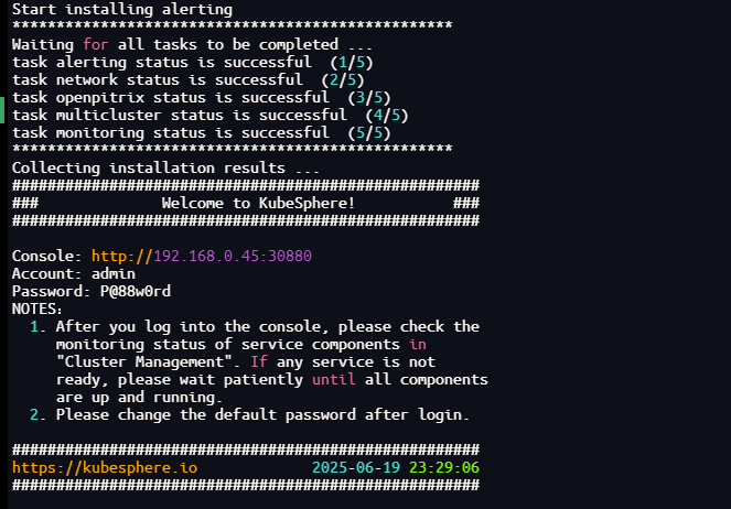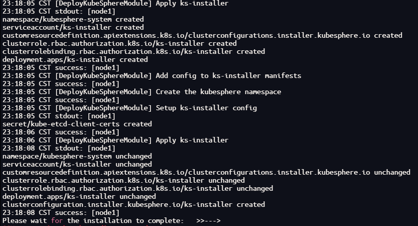 期间可以通过kubectl logs -n kubesphere-system $(kubectl get pod -n kubesphere-system -l 'app in (ks-install, ks-installer)' -o jsonpath='{.items[0].metadata.name}') -f 查看安装进度