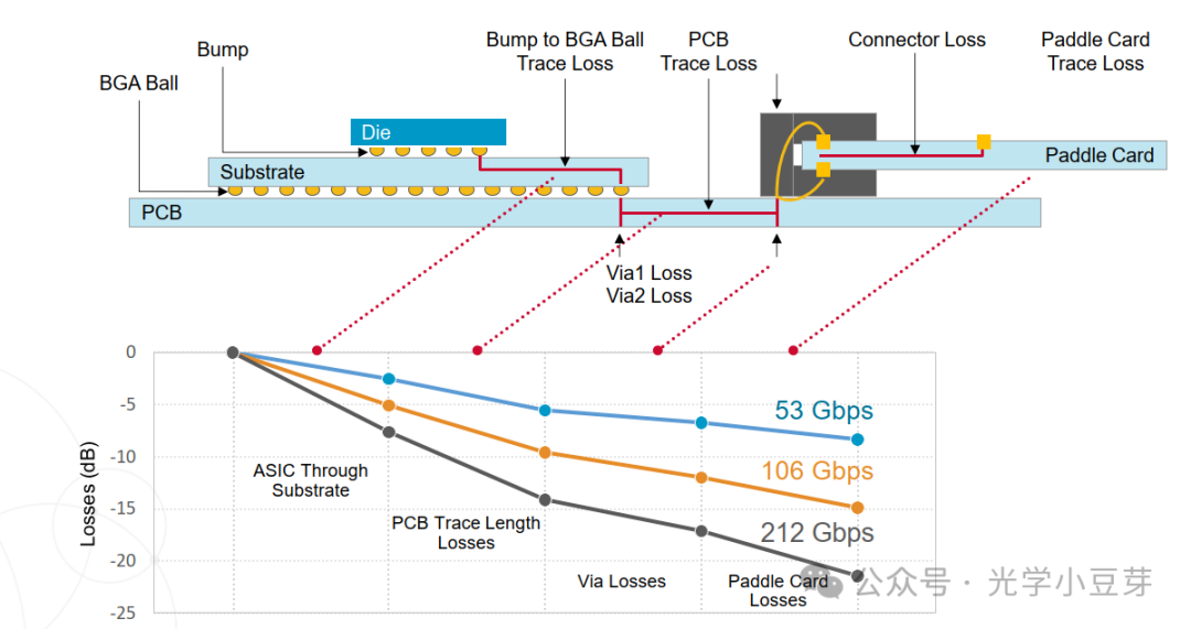 根据Broadcom的分析,单波100G时,LPO的电学链路损耗约为15dB, CPO场景仅有5dB, 单波200G时,LPO的链路损耗约为21dB, CPO约为8dB。在LPO MSA里则要求switch芯片到模块总的电学损耗不能大于20dB。两者的链路损耗差距较大,这是两者在功耗、带宽等性能上有差异的根因。