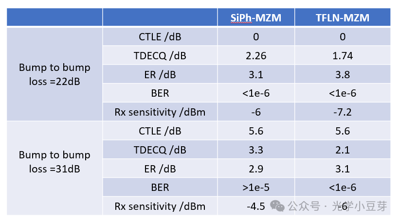 海信展示了单波200G情况下的LPO仿真结果,需要优化电学损耗,并通过CTLE来补偿电学链路损耗。在电学损耗为22dB时,不需要使用CTLE功能,两种方案都可以实现BER<1e-6。而当电学损耗增加到31dB时,CTLE需要增加到5.6dB,此时硅光方案的BER在1e-5水平,而TFLN方案的BER仍可控制下1e-6以下。200G场景下也可以使用LRO(linear receive optics)方案,只在Tx端增加retimer,对host端发出的信号进行补偿。