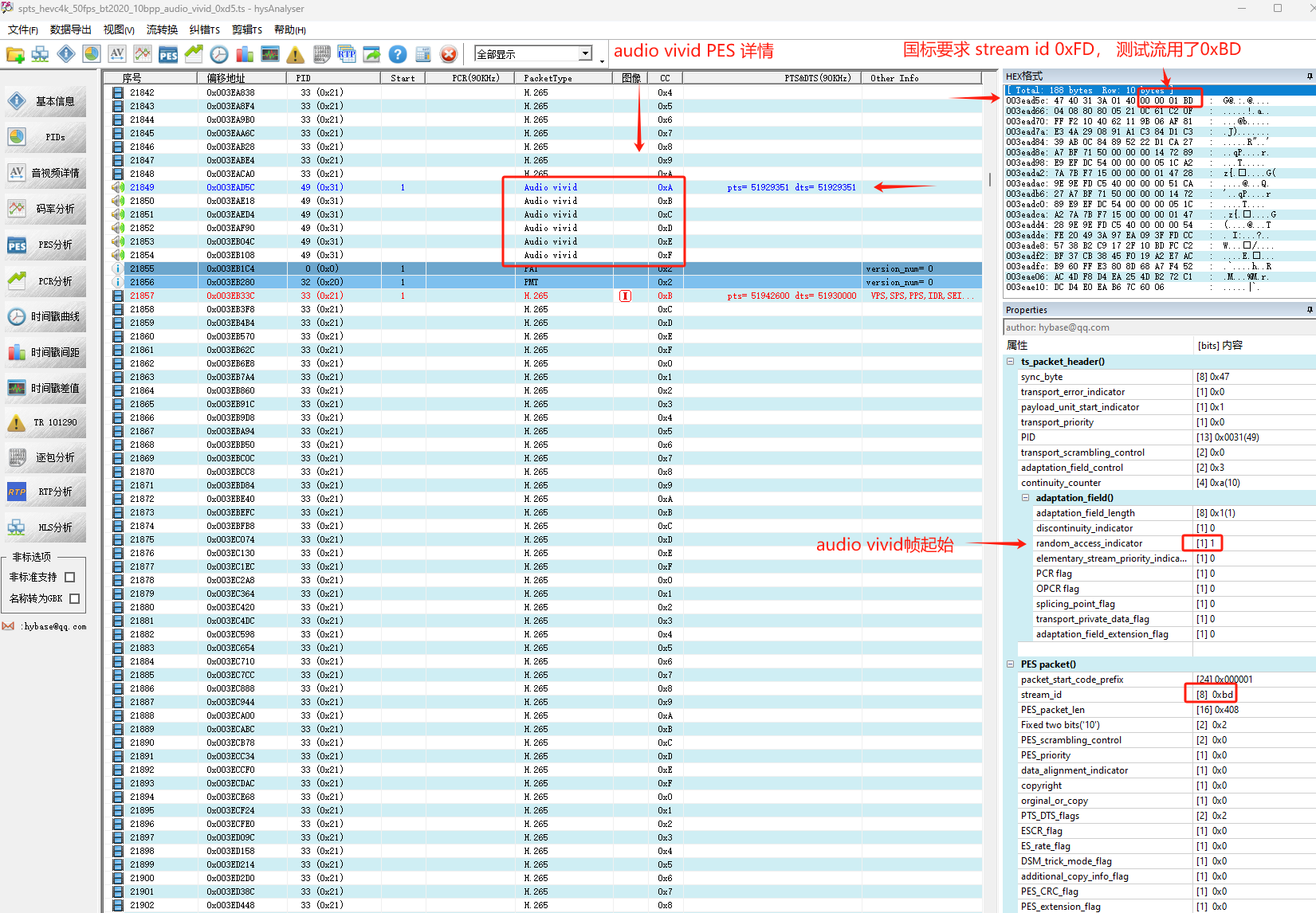 注释:《超高清音视频编码码流网络传输封装技术要求-报批稿-202503》7.4.2 小节,约定stream_id取值为 '1111 1101' (0xFD),本次测试流为 0xBD。