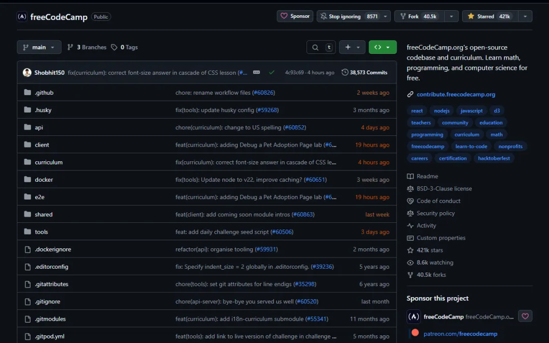 今天分享一个 Github 上一个 421K Star 且排名第一的开源项目:freeCodeCamp(免费编程学习平台)