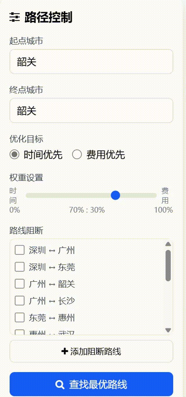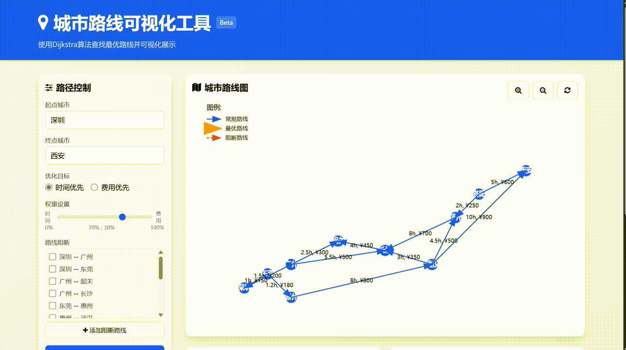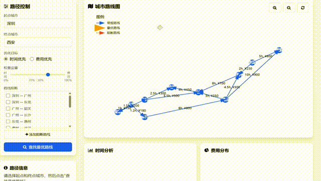设计一个城市路线可视化工具,可以帮助快速查找城市之间的最优路线,并以可视化的方式呈现。可以选择起点和终点城市,设置优化目标(时间优先或费用优先)和权重,还能添加路线阻断信息。工具会实时计算并展示最优路线、总运输时间和费用,同时提供时间分析和费用分布的图表。