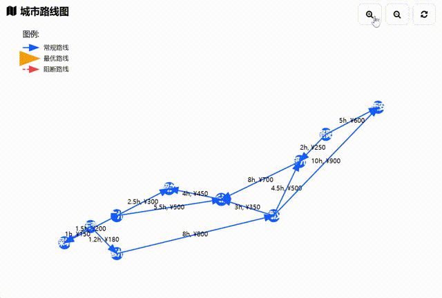 可视化地图:把古代驿道换成 SVG 线条,高亮的最优路线用橙色标出来,像不像给荔枝铺了条「黄金传送带」?阻断的路段直接标红,比遇到劫匪还醒目;