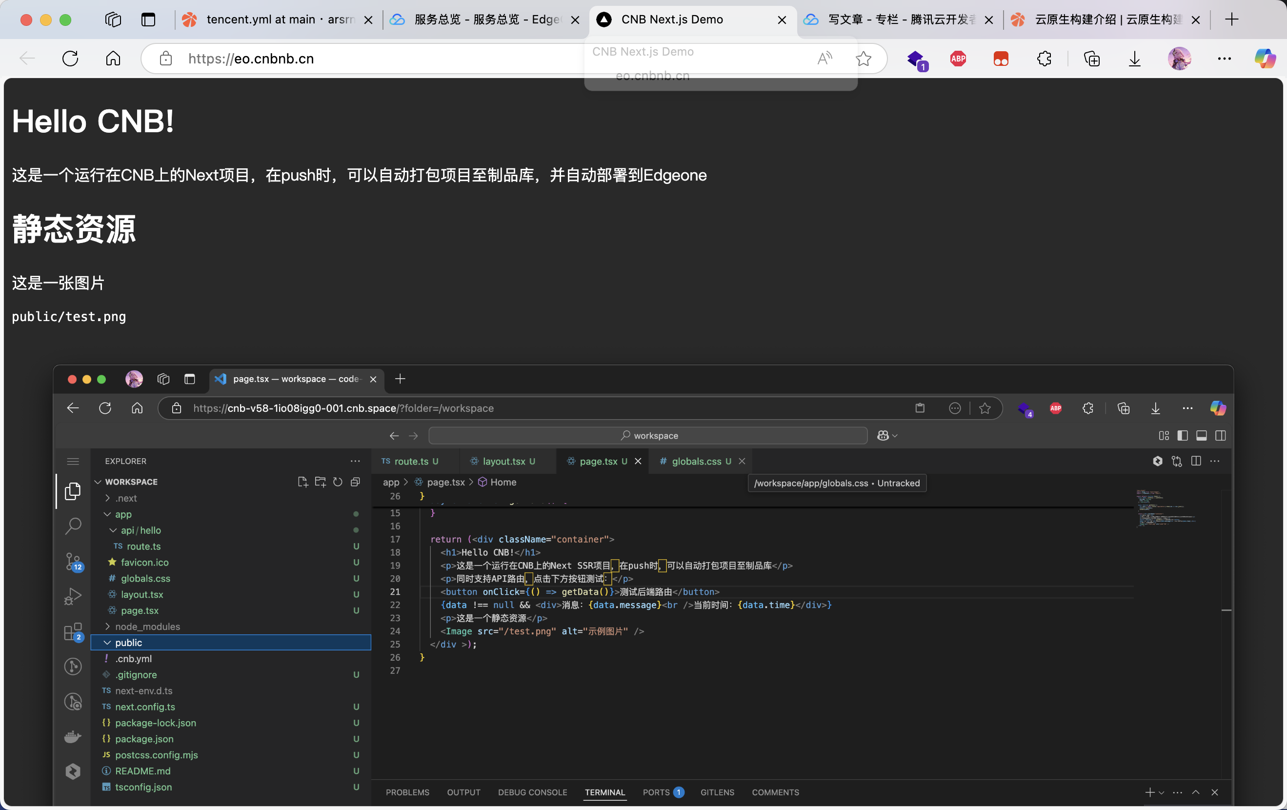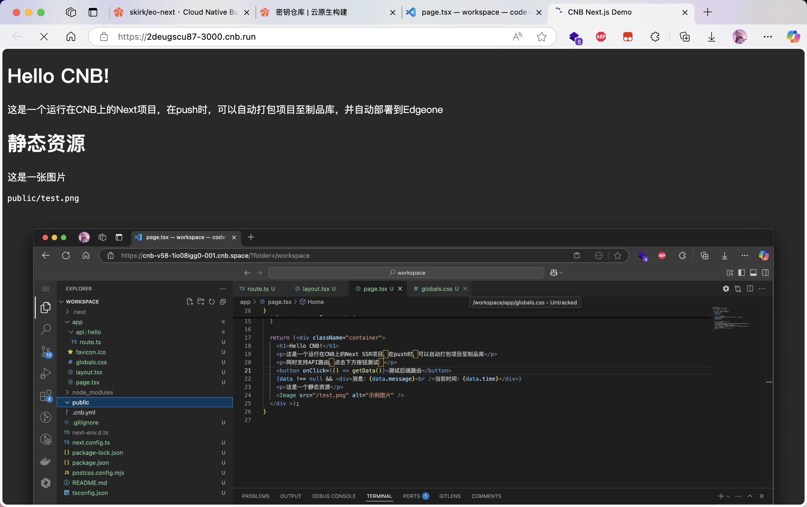 ,然后ports面板里面CNB自动将3000端口映射到了公网,可以预览当前开发代码的效果,就跟本地开发一样了,在webide中修改,对应预览页面会实时更新。
