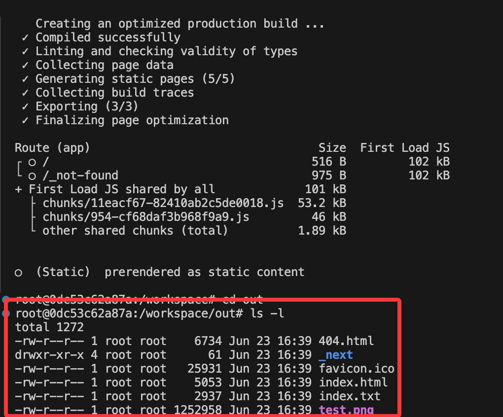 后,由于前面设置了静态输出,在运行命令之后会构建静态的资源