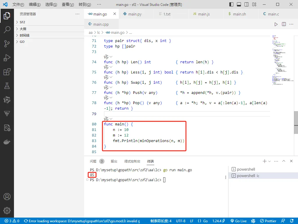 n 到 m 的最小代价路径。n 开始,初始代价为 n。m 时,返回当前的总代价;如果堆为空且未找到 m,则返回 -1。np,大小为 10000,np[i] 为 true 表示 i 是合数或 1。true(非质数)。i 从 2 开始,如果 i 是质数(np[i] 为 false),则标记其所有倍数为合数。n 或 m 是质数,直接返回 -1。dis,大小为 10^len(n)(即所有可能的数字范围),初始值为无穷大。dis[n] 初始化为 n(初始代价)。(n, n) 加入最小堆,表示从 n 出发,当前总代价为 n。x。x == m,返回当前总代价。x 的每一位:d,如果 d > 0,可以减 1 生成新数字 y。d < 9,可以加 1 生成新数字 y。newD = disX + y(disX 是 x 的当前总代价)。y 是合数(或 1)且 newD < dis[y],更新 dis[y] 并将 (newD, y) 加入堆。m,返回 -1。np 数组:O(10000)。dis 数组:O(10000)。.