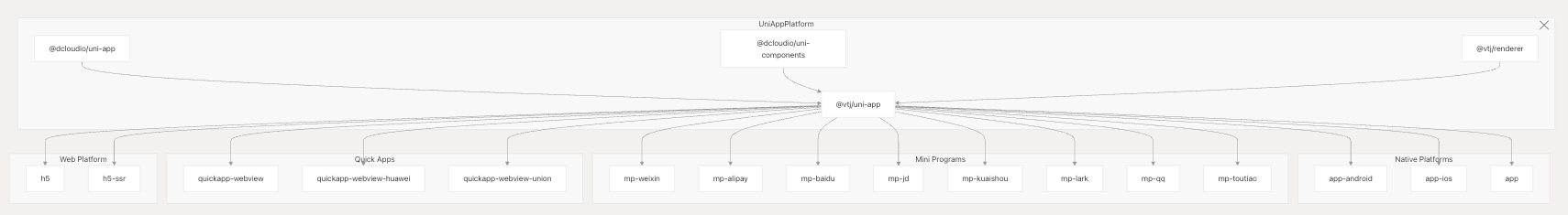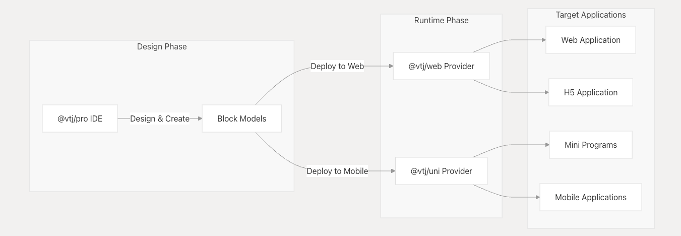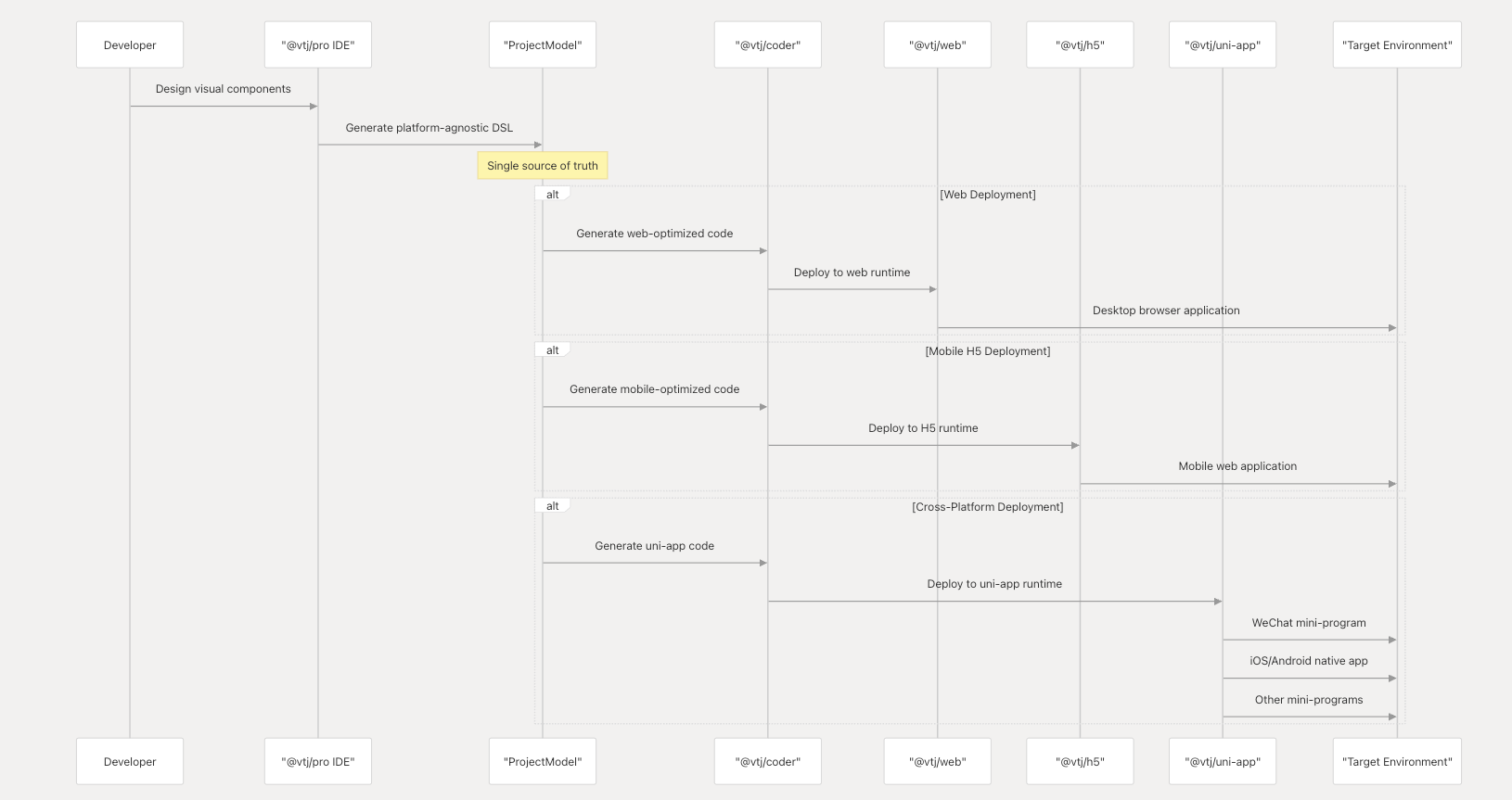 VTJ 通过针对不同运行时环境的专用平台包提供多平台部署支持。每个平台实施都针对特定部署场景优化了低代码运行时,同时保持了统一的开发体验。
