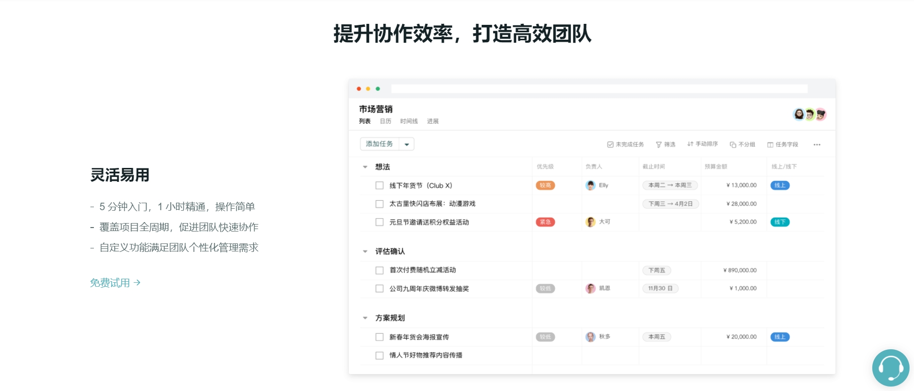飞书多维表/文档 | 数据/任务自由组合,灵活定制 | 信息化程度高的团队 | 免费/中 | 中 |