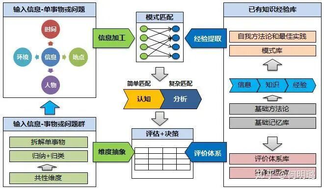 我们将这个定义进一步展开,即是我们接收到外在信息的输入,我们的大脑会对接收到的信息进行降噪,加工和模式匹配处理,在处理的过程中我们需要借助我们大脑里面已有的基础记忆,知识和经验信息。即外在输入+内在知识经验共同进行处理加工和模式匹配后形成有价值的输出。