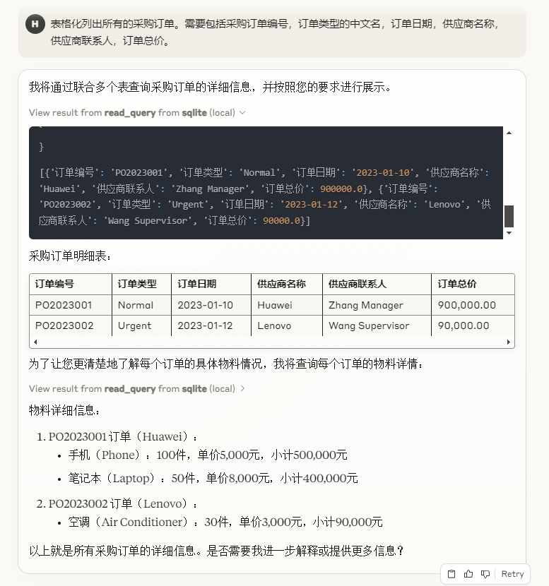 对于数据库这块,我创建了一个简单的包括供应商,物料,用户,订单等数据表的Sqlite数据库。然后我就可以基于数据库内容和Claude进行沟通和协同。