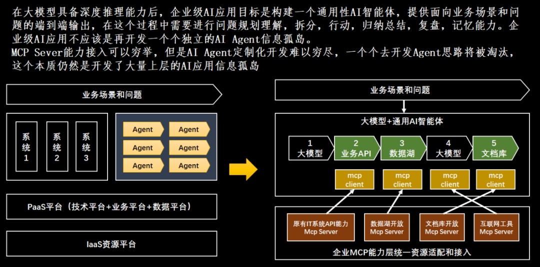 企业AI应用的重点不要放在上层AI智能体的开发,虽然这个看起来可能见效快,但是这种大量的AI智能体和传统的单体应用小烟囱没有太大的区别,仍然是一个个的信息孤岛。