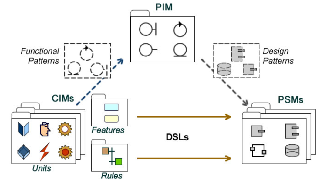第二个就是MDA模型驱动架构,这个差不多出来也有20多年时间了。所以说在模型驱动架构里面,它核心的思想就是我去建设一套模型,这个模型是可以驱动自动生成相关的软件和代码的。当然这个模型里面本身就包括了跟语言无关模型和跟语言相关模型,这个我在今天不展开了。