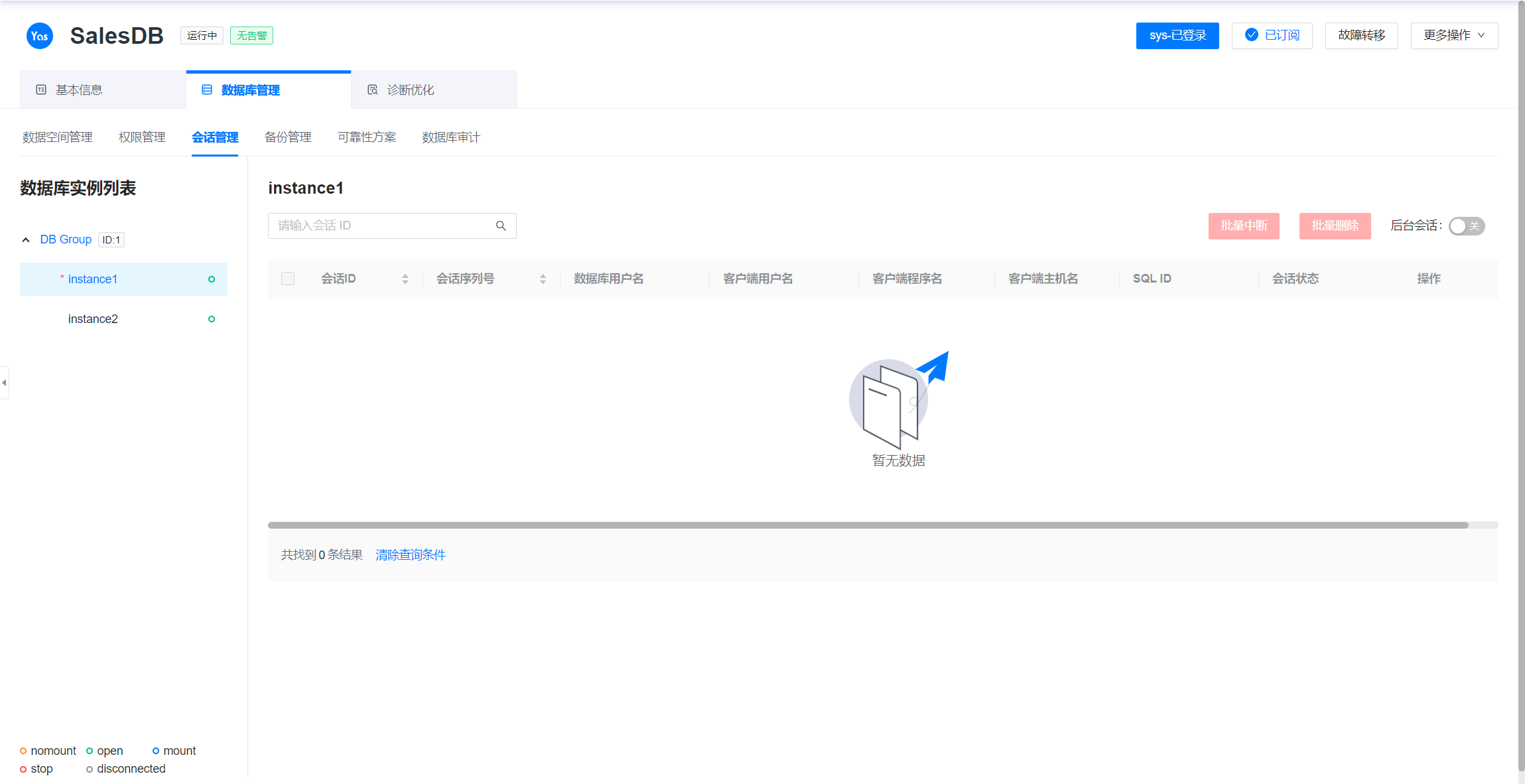 会话管理提供查看当前实例已经连接的会话信息,用户会话的删除和中断功能。