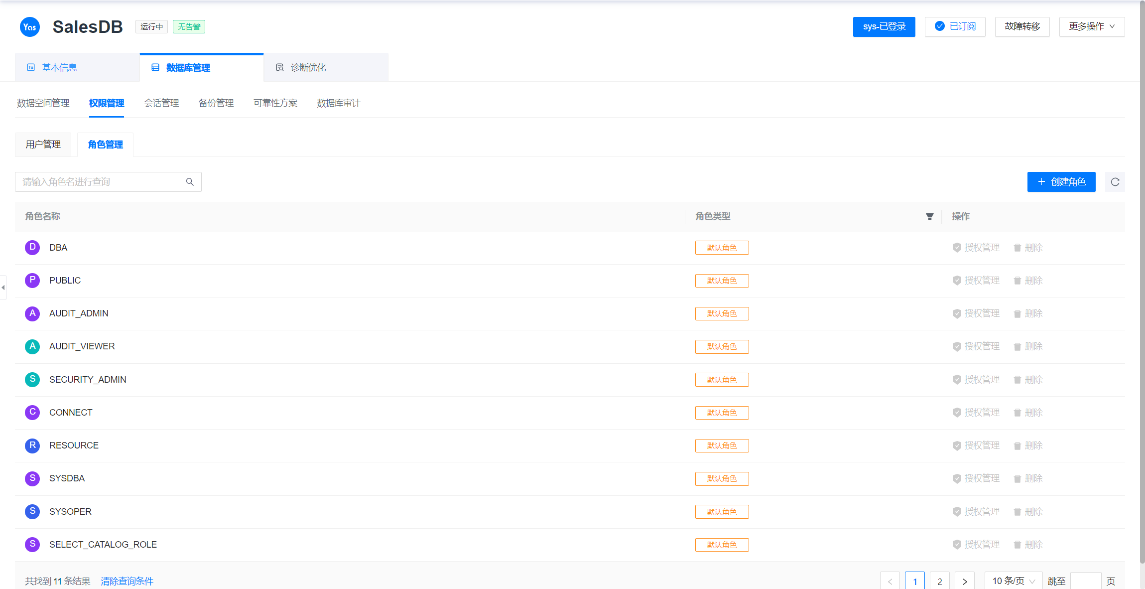 角色管理您可进行数据库角色创建、授权管理等操作。