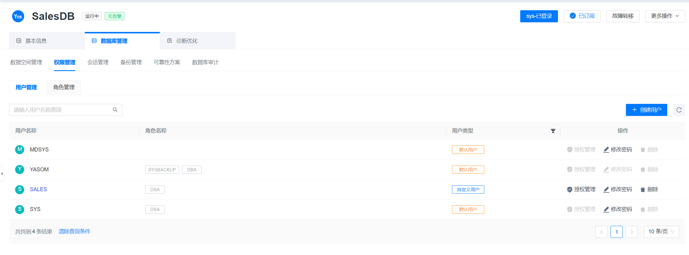 用户管理您可进行数据库用户创建、授权管理、密码修改等操作。