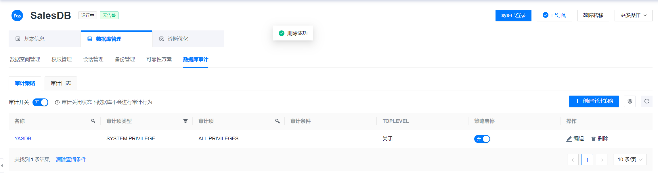 网页路径:【YashanDB】>【YashanDB列表】>【数据库名称】>【数据库管理】>【数据库审计】